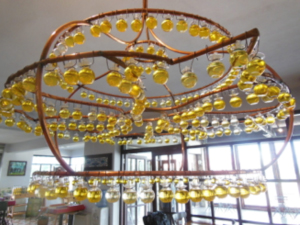 Laleliの担当者とは店舗で会って話しを聞いた。オリーブオイルやオリーブ等の自社製品を販売している店舗内にレストラン&カフェがある。上の写真にあるシャンデリアらしきものはオリーブオイルが入った瓶の数々である。